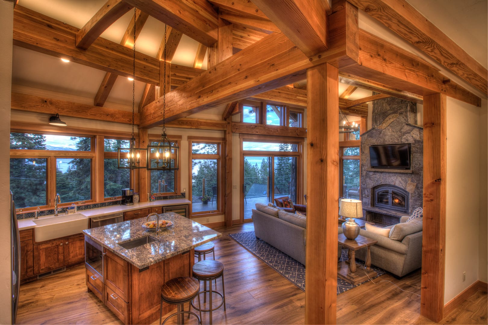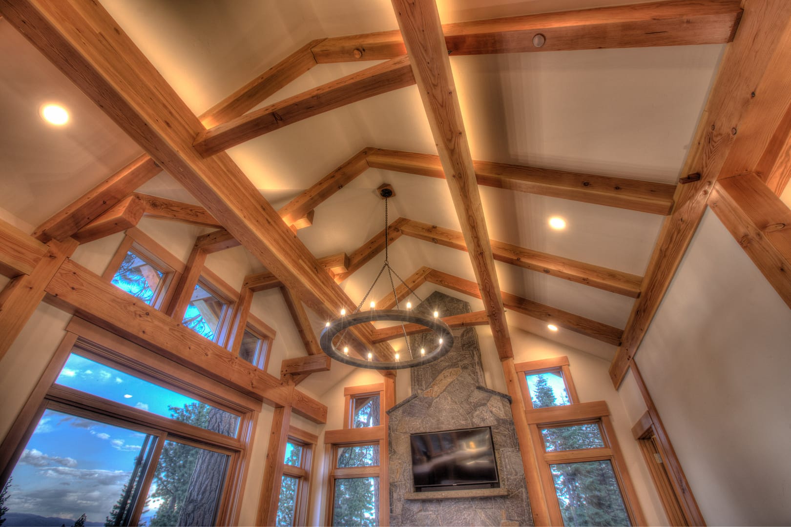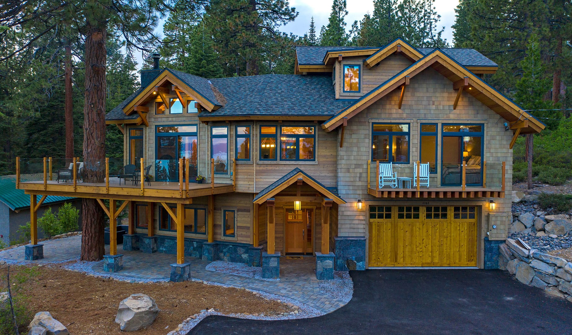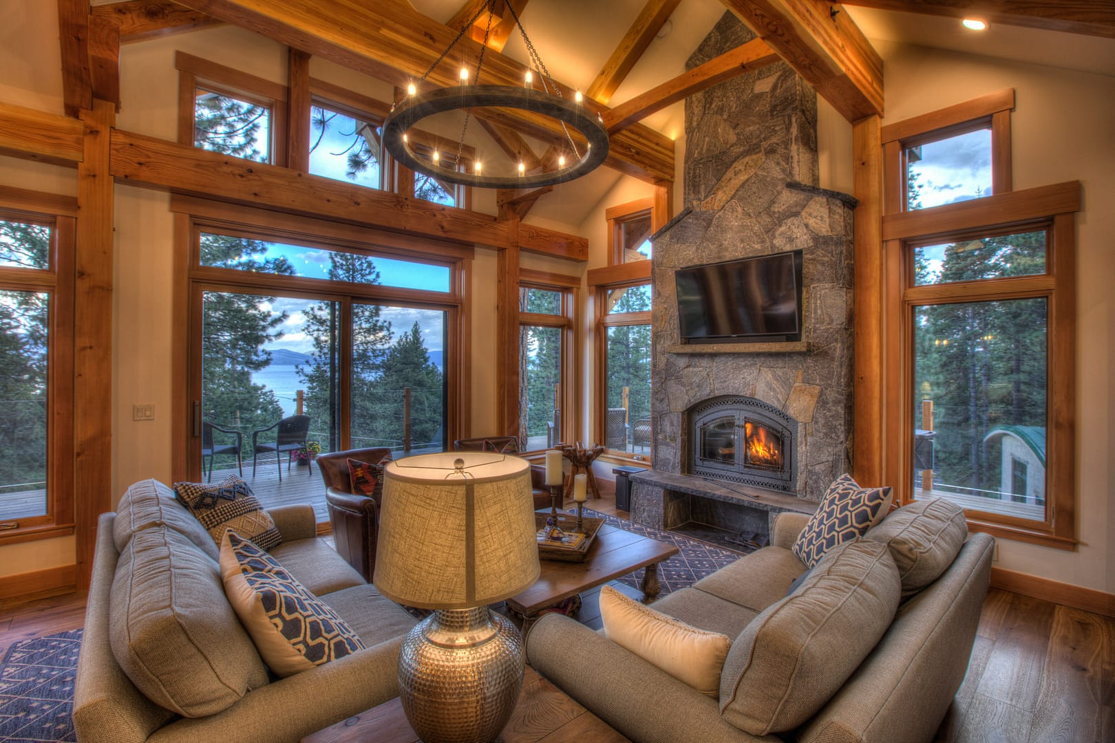 Like many new home designs within the Lake Tahoe Basin, this home design presented several hurdles to overcome including saving a large existing heritage tree and integrating the tree into the new home design without damaging the tree. The final design solution created a traditional timber framed great room space with related exterior areas, which saved the tree, and captured the views beyond to Lake Tahoe and the surrounding mountains.