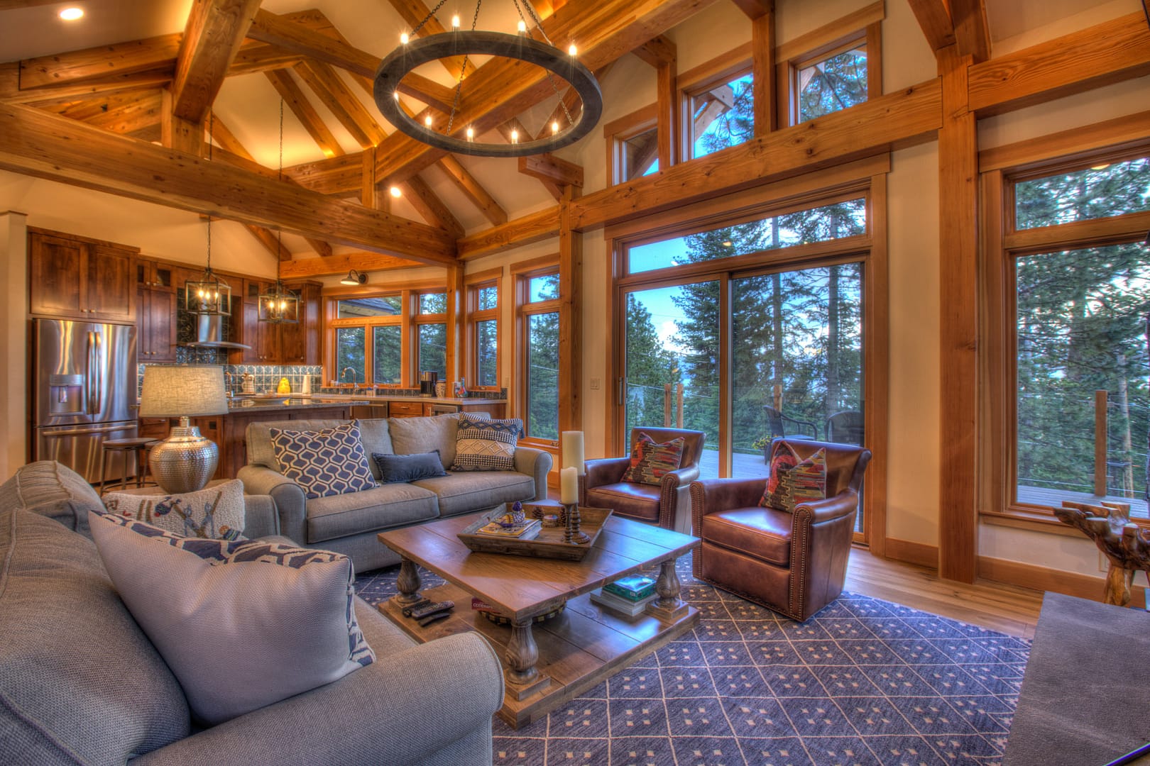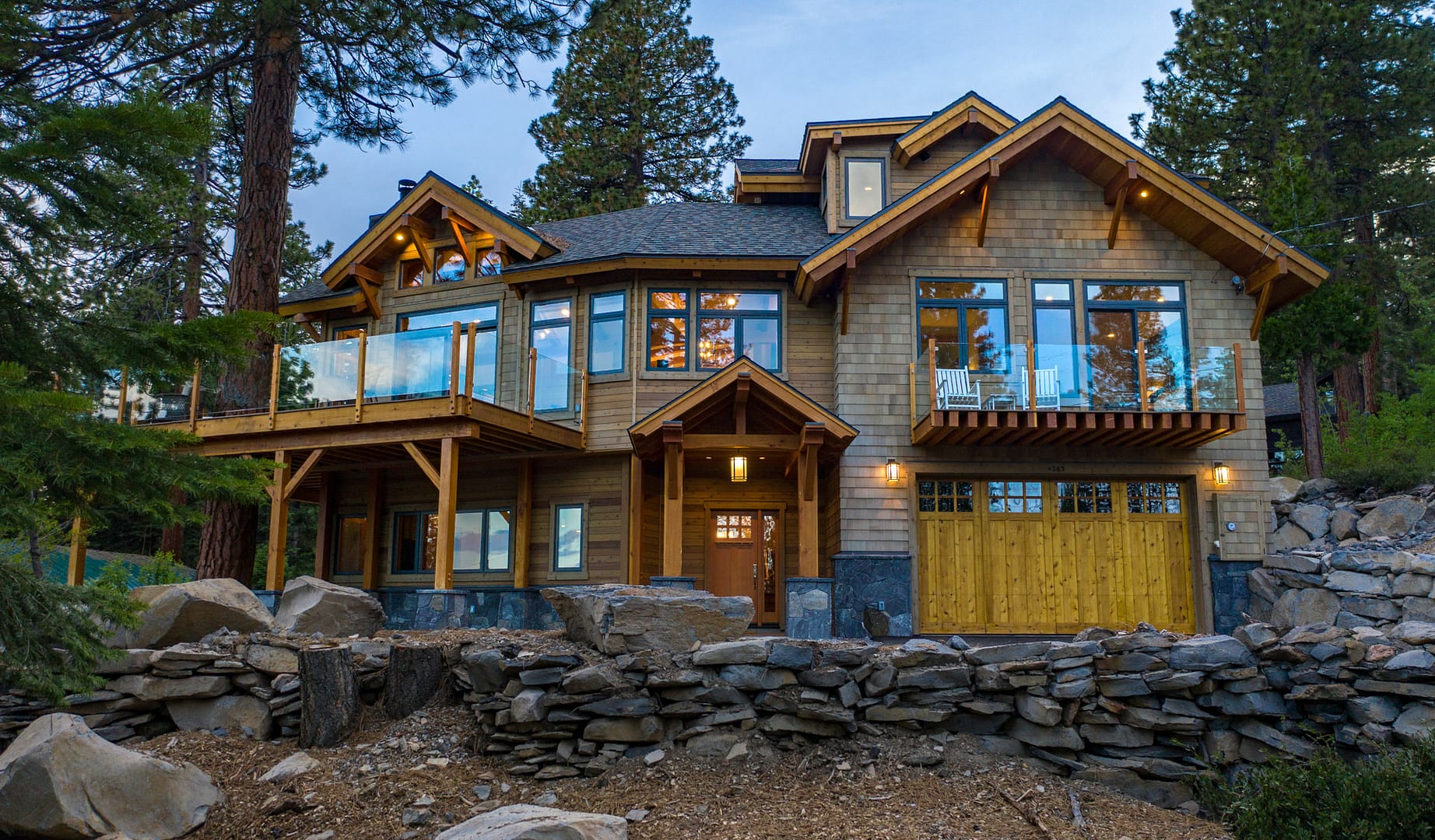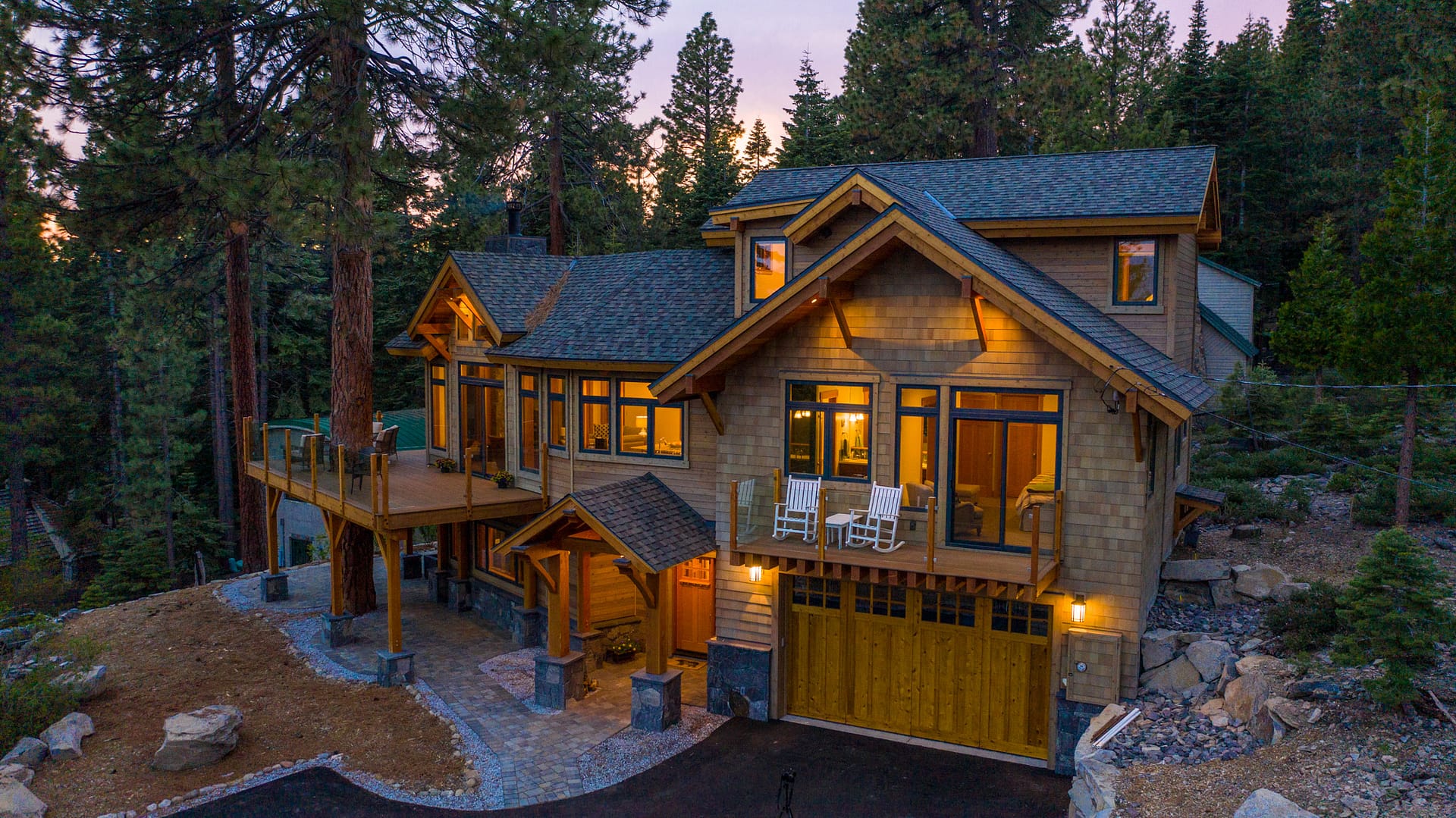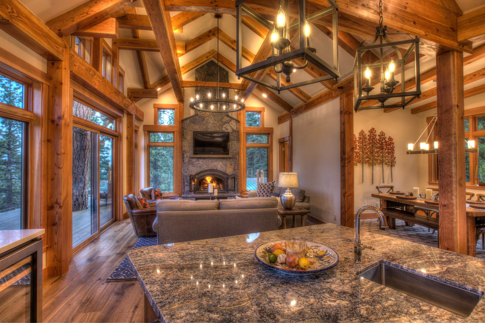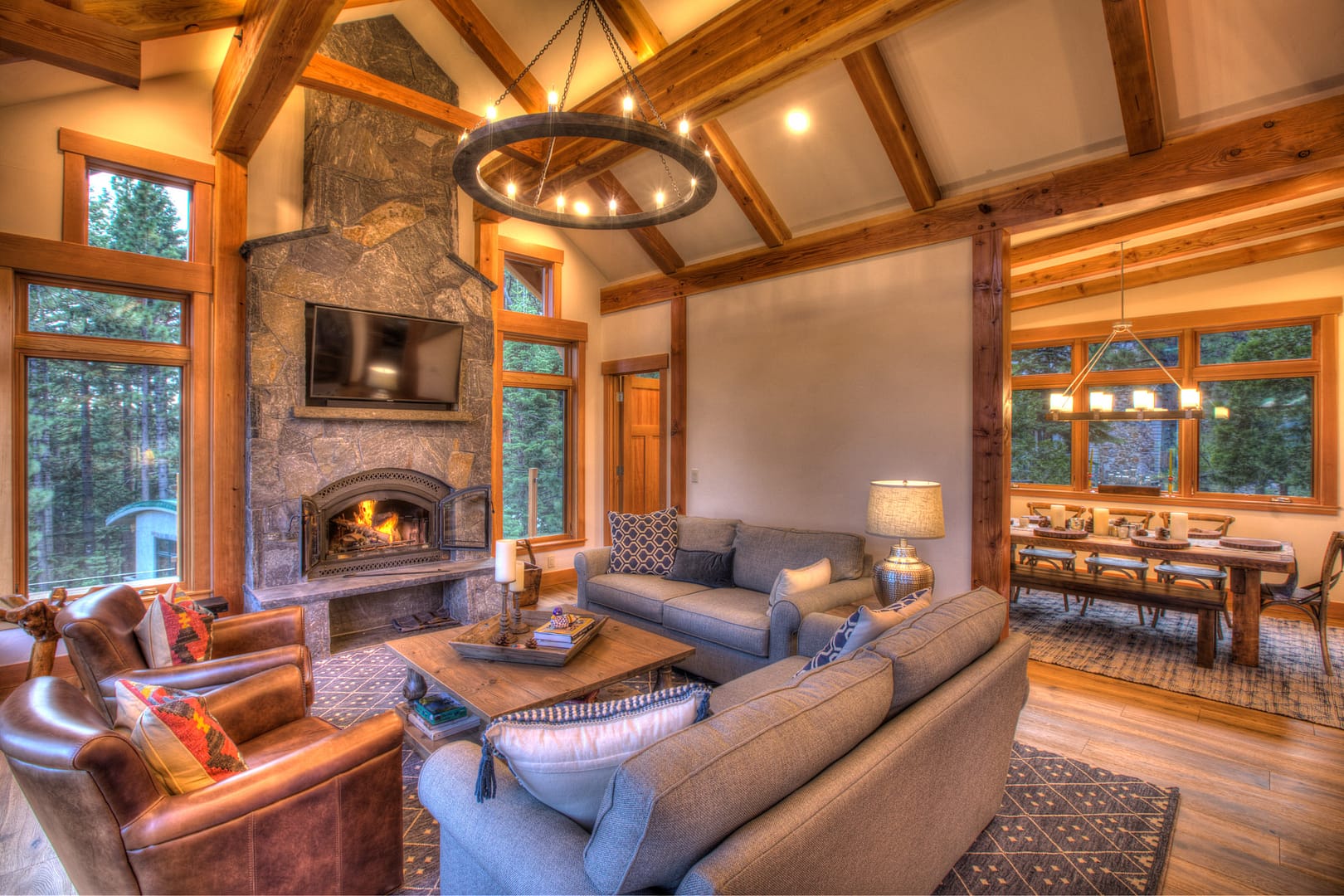 Like many new home designs within the Lake Tahoe Basin, this home design presented several hurdles to overcome including saving a large existing heritage tree and integrating the tree into the new home design without damaging the tree. The final design solution created a traditional timber framed great room space with related exterior areas, which saved the tree, and captured the views beyond to Lake Tahoe and the surrounding mountains.