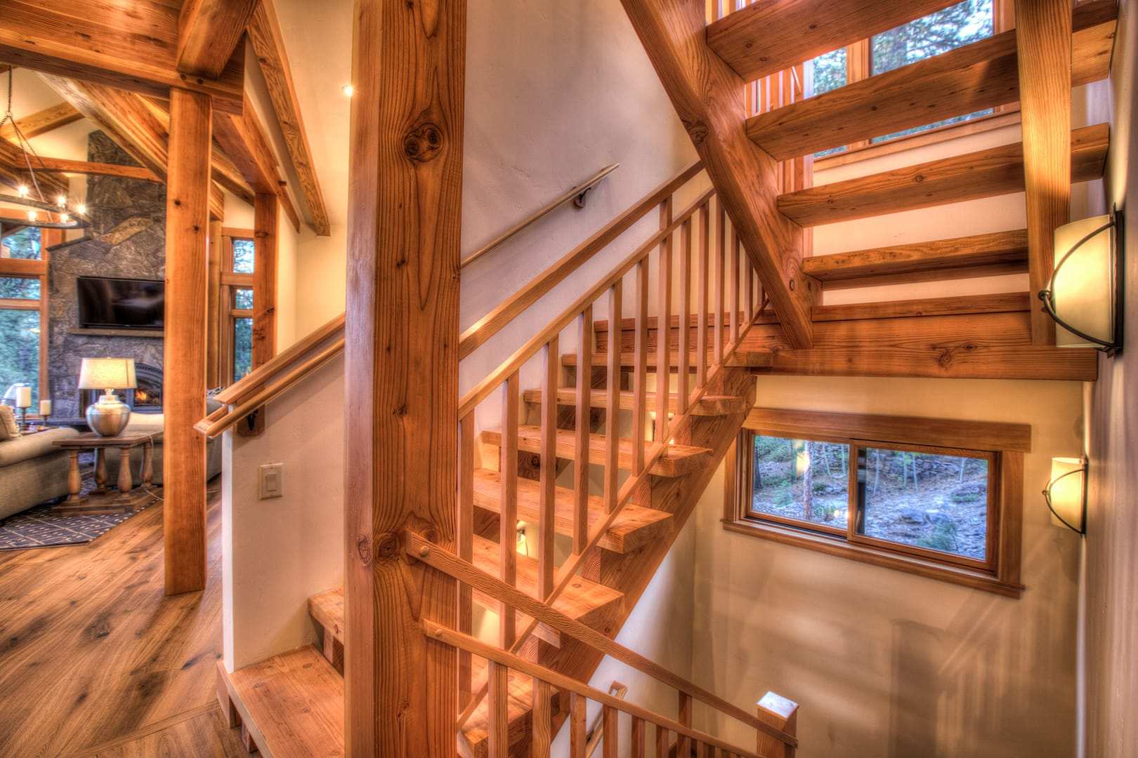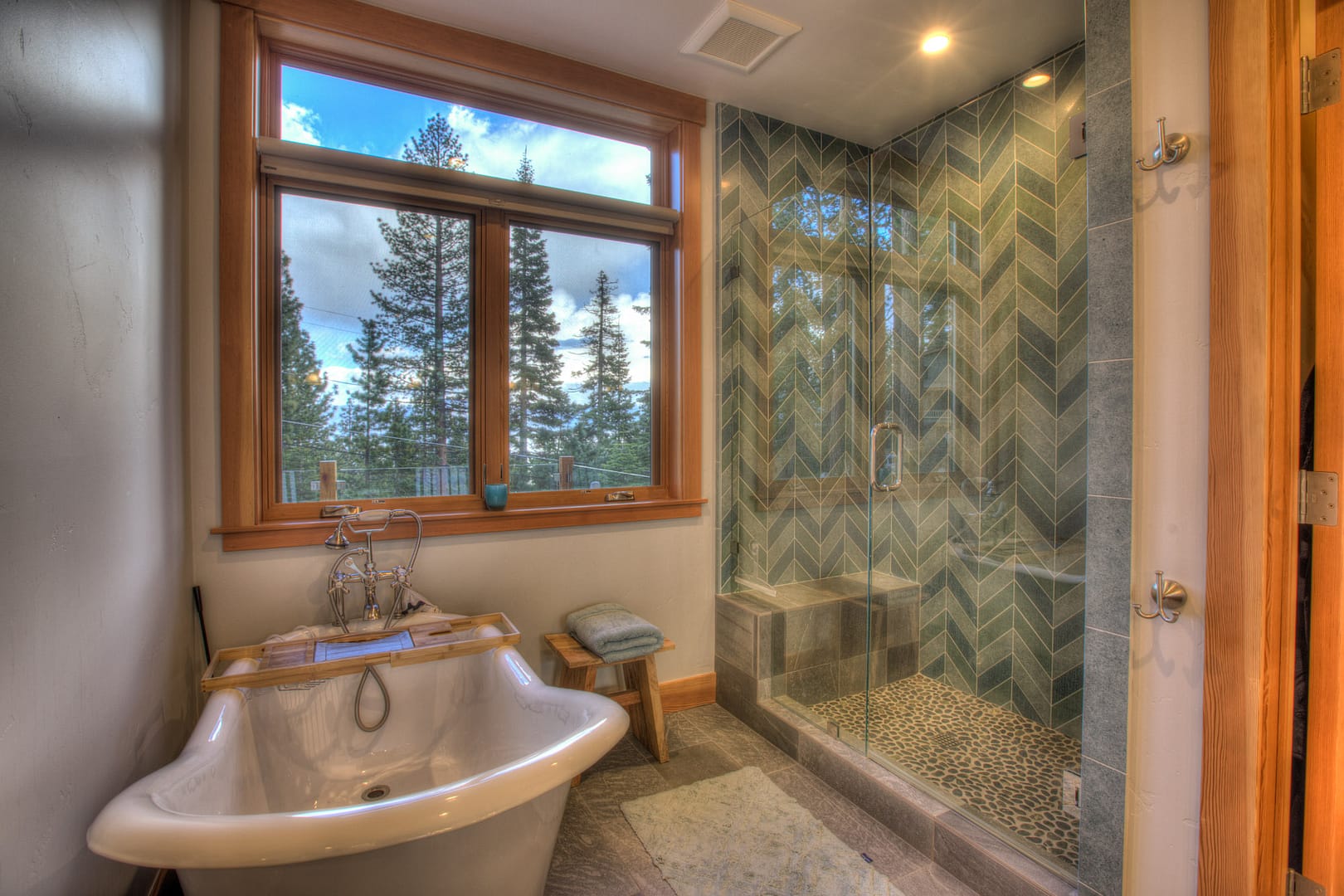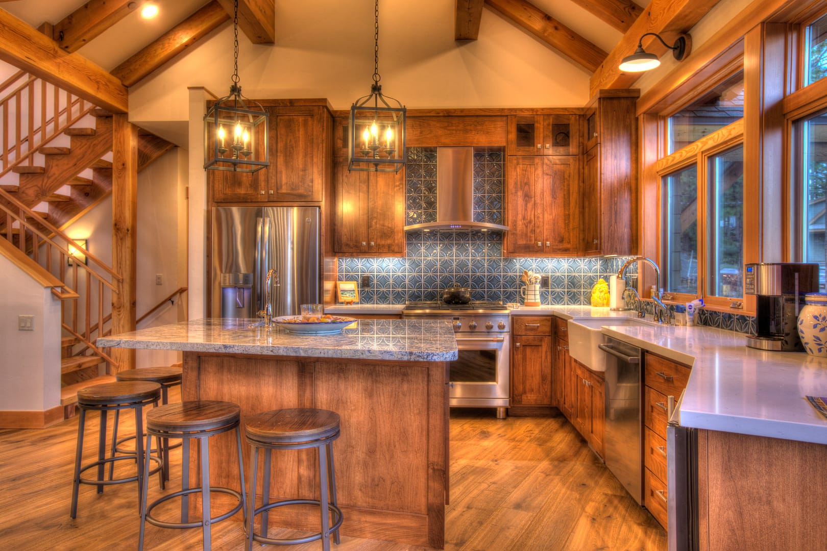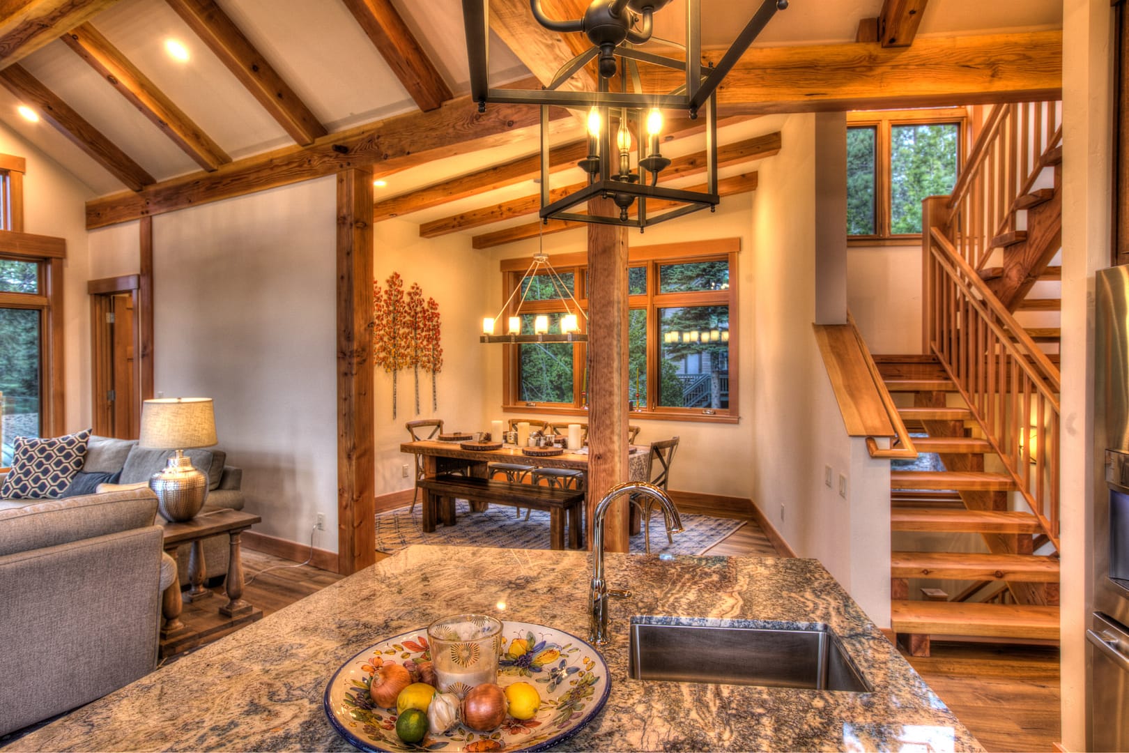 Like many new home designs within the Lake Tahoe Basin, this home design presented several hurdles to overcome including saving a large existing heritage tree and integrating the tree into the new home design without damaging the tree. The final design solution created a traditional timber framed great room space with related exterior areas, which saved the tree, and captured the views beyond to Lake Tahoe and the surrounding mountains.